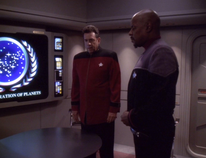 Admiral Bennett, (who loves his new holocommunicator and will use it forever and not, a week from now, get bored with it and throw it in the back of his closet like everyone else) has the task of informing Bashir's dad of his two year prison sentence. By taking all the blame, Richard saves his son's career. Bennett reminds everyone that the stiffness of these penalties are supposed to stop people making more super-zealot Khan Singhs like they did two hundred years ago. (Bennett accidentally revealed himself to be an unmodified, imperfect human: Khan was born FOUR hundred years ago.)